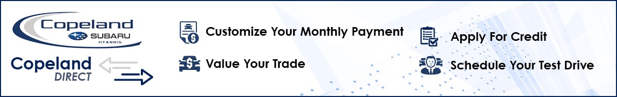Take advantage of our Copeland Direct online shopping tools today and swiftly move financing right along for your next purchase or lease! If you have any questions, our friendly staff at Copeland Subaru Hyannis is simply a quick phone call or email away. We look forward to hearing from you.